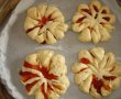 Aluatul se imparte in bucati egale, rotunde si se mai lasa la crescut. Se pune in mijloc umplutura dupa care se strang marginile la gura ca la un sac (vezi imagine) apoi apesi usor in mijloc pentru a acoperi umplutura. Se cresteaza marginile si se rasucesc in sens invers formand astfel o floare. Pentru a nu se lipi cutitul de aluat il puteti da prin ulei sau se poate chiar folosi o foarfeca de bucatarie. Se ung cu ou batut si se mai lasa cateva minute la crescut.