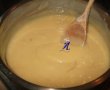 Crema: Intr-o cratita de inox, se amesteca galbenusurile cu zaharul, faina, laptele si zaharul vanilat si se pune pe foc, amestecand constant pana se ingroasa. E posibil sa se face niste cocoloase, care se disperseaza, amestecand mereu in crema.