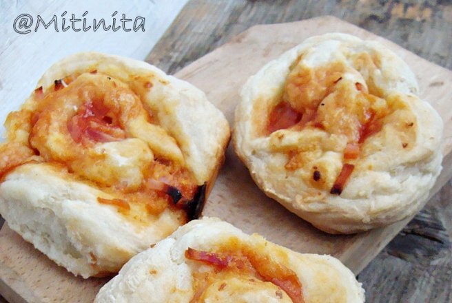 Intindem aluatul intr-o forma dreptunghiulara. Punem ketchup-ul,salamul si sunca si apoi presaram cascavalul. Rulam si taiem in 12 bucati egale.
