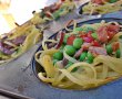 Incingem un pic de ulei de masline si calim afumatura taiata marunt impreuna cu ceapa rosie taiata julien, usturoiul maruntit, ardeiul taiat cubulete, adaugam si broccoli cu mazarea, saram, piperam si condimentam, dupa preferinta. Umplem cuibuletele de taitei cu aceasta umplutura, infoind un pic cosuletele cu o furculita, pentru a curge umplutura si intre paste, stropim cu un pic de ulei de masline.