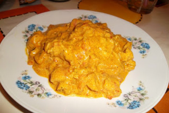 Pieptul de pui se spala si se taie cubulete. Intr-o tigaie se pune untul si pieptul de pui .Se lasa pana se rumeneste apoi pieptul se scoate din tigaie. Ceapa se taie marunt, rosiile se curata de seminte si se taie cubulete la fel si ardeiul si se pun in tigaie. Se lasa 5 min la calit apoi se adauga sarea, piperul, scortisoara, boiaua dulce, pudra de curry, usturoiul si se lasa pe foc. Dupa ce s-au calit se adauga smantana si pieptul de pui prajit si se mai lasa 3-4 minute, apoi se poate servi.