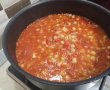 Separat se pun la călit în 2 linguri de ulei de măsline ceapa și ardeiul tocate mărunt. Se adaugă roșiile cubulețe, condimentele și năutul (fără zeama din conservă) și se mai lasă câteva minute până începe sosul să fiarbă. Se pune puiul în sos și se lasă pe foc mediu cu capacul pus până scade lichidul lăsat de roșii.
