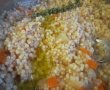 2. Adauga cuscusul in apa si lasa sa fiarba 6 minute scurge apoi surplusul de apa si lasa sa ramana doar cat sa ajunga la nivelul cuscusului .