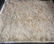 Am procedat la fel cu alte trei foi (in total cinci), am asezat apoi nuca trecuta prin robot si amestecata cu zaharul pudra, am nivelat nuca in strat uniform, apoi am pulverizat apa de trandafiri iar peste nuca am asezat din nou o foaie de placinta , am presat usor sa uniformizez stratul de nuca,am uns bine foaia cu unt topit si la fel am procedat cu restul foilor.