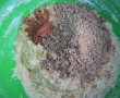 Se bat bine uleiul cu zaharul, apoi se adauga pe rand apa minerala, sucul (stors) de portocale, esenta rom, faina, praful de copt, bicarbonatul, sarea, scortisoara si nuca macinata.