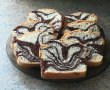 Tapetam cu hartie de copt o tava de chec si incepem sa distribuim cu lingura. Punem o lingura cu compozitie de cacao peste care adaugam o lingura de compozitie alba si tot asa pana epuizam ambele compozitii.