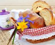 Drojdia se freaca cu o lingura de zahar pana cand devine lichida. Se adauga laptele cald si putina faina cernuta. Se amesteca totul si se lasa sa creasca la loc cald. Dupa aceea, se adauga ouale, zaharul, zaharul vanilinat, sarea, esenta de vanilie si faina cat cuprinde. Se framanta aluatul, apoi se ung mainile cu ulei si se formeaza o bila. Se lasa coca sa creasca la loc cald.