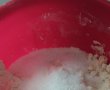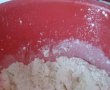 Se cerne faina si se adauga untul, se framanta bine pana se omogenizeaza bine si devine un aluat sfaramicios. Se adauga si zaharul si se amesteca cu ingredientele uscate.