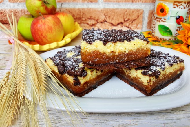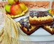 Intr-o tava unsa cu unt se intind 3/4 din aluat, se adauga merele, amestecul cu branza, iar la final se rade restul de aluat, presarandu-l peste prajitura. Se introduce tava la cuptor pana cand blatul este copt.