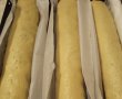 Transferăm rulourile în tavă, pe hârtii de copt separate pentru fiecare rulou, așa încât să nu se lipească intre ele.