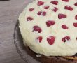 Intre timp se topeste ciocolata amaruie cu smantana pentru frisca la foc mic. Se lasa sa se racoreasca usor apoi se toarna peste blatul de biscuiti. Se intinde pe toata suprafata apoi se unge cu crema de vanilie. Din loc in loc se asaza zmeura congelata (sau proaspata daca aveti) si se pune deasupra blatul insiropat cu laptele. Se pastreaza la rece pana a doua zi.
