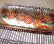 Pestele marinat se pune peste rosii, se pune si vinul alb si se pun citeva feliute de rosii peste peste. Daca mai este necesar se mai condimenteaza putin pe deasupra cu sare, piper si cativa stropi de ulei de masline. Se da la cuptorul incins la 180 grade pt 20-25 minute.