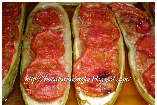 -cu aceasta umplutura vom umple "cojile"de dovlecel,asezam felii de rosii deasupra,stropim cu ulei,si adaugam 1 cana de apa
