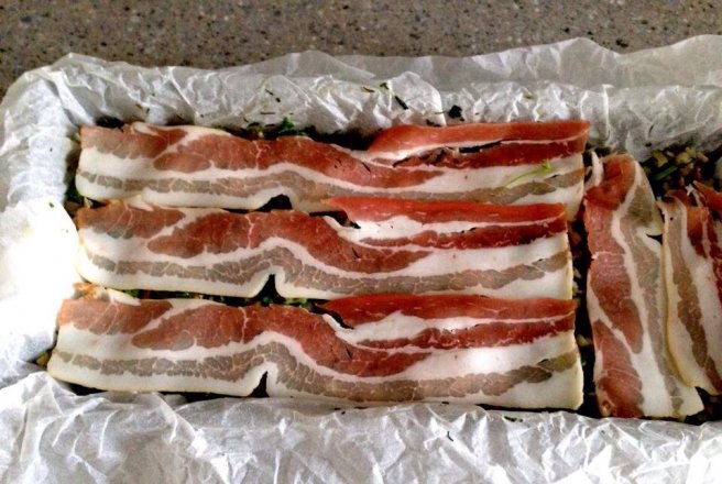 Se amestecă pentru omogenizare. Se așează jumătate din compoziție într-o tavă, în strat uniform, apoi cele două ouă gătite și se acoperă cu restul de compoziție. Deasupra, se așează fâșiile de bacon și se introduce tava în cuptorul preîncălzit pentru 40-45 de minute.