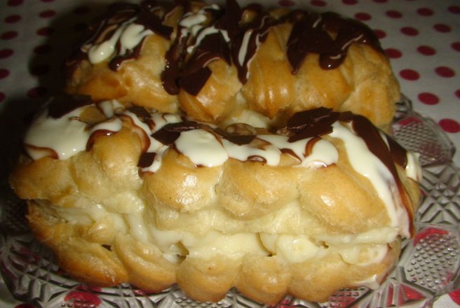 Se prepara crema: se pune laptele la incalzit. Separat se freaca bine galbenusurile cu zaharul si amidonul praf, apoi se adauga esenta de vanilie. Se toarna laptele cald peste amestecul de galbenusuri, apoi totul se pune la fiert amestecand continuu pana se ingroasa crema. Se da la racit si se amesteca cu frisca lichida. Se bate crema cu mixerul.
