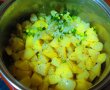 Cartofii se curata, se spala si se taie cubulete. Se pun la fiert in apa cu sare, 15 minute. Se scurg apoi de apa si se amesteca cu ulei, sare, piper si ceapa verde taiata rondele,