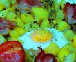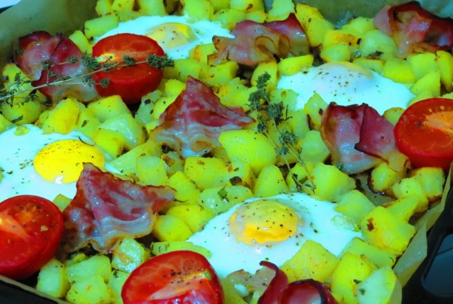 Se pregateste o tava cu hartie de copt si se rastoarna cartofii. Se pun in cuptorul incins, la foc mediu, inca 15 minute, pana incep sa se rumeneasca usor. Se scoate tava si se formeaza 4 goluri printre cartofi in care se sparge cate un ou. Se aseaza printre cartofi feliile de bacon si rosiile taiate pe jumatate. se presara cimbru uscat si se aseaza si cateva crengute de cimbru deasupra. Se mai pune tava in cuptor 10 minute, pana ce oul este facut. Se serveste calda.