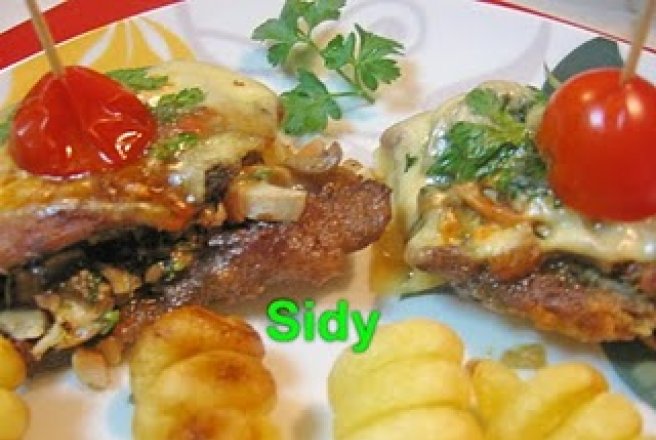 Peste feliile de escalop prajite asezam ciupercile apoi cate o feliuta de cascaval si 1/2 rosie cherry cu cate o frunzulita de patrunjel verde. Dam la cuptorul incins pentru gratinare sau la cuptorul cu microunde 3-4 minute sa se topeasca cascavalul.