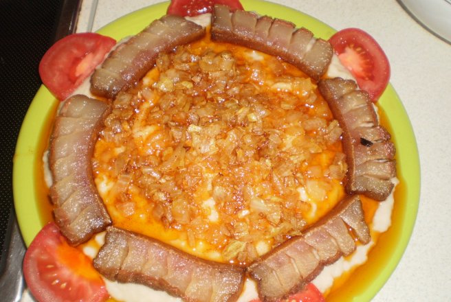 Slanina o taiem fasii mai lungi pe care le crestam si le prajim putin intr-o tigaie fara ulei, cand slanina este gata o asezam pe platou peste fasole, ceapa o calim in uleiul de la slanina si adaugam un varf de cutit de boia dulce. Ceapa calita o turnam peste fasole impreuna cu uleiul ramas. Putem servi cu muraturi rosii etc.