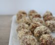 Ne umezim mâinile în apă rece și formăm biluțe în care așezăm o alună în mijloc, urmând ca apoi să modelăm în continuare biluța. Trecem biluțele apoi prin restul de alune măcinate (200g) și le așezăm pe o farfurie învelită în folie alimentară și le lăsăm la frigider 10 minute.