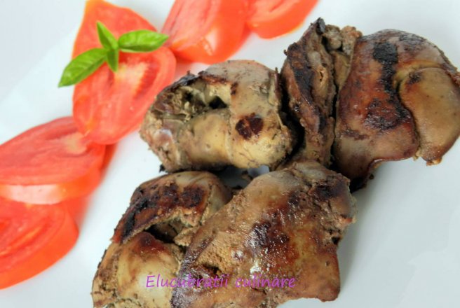După alte 3 minute și un pic de fum în bucătărie - pentru că nu am pus capac - ficățeii sunt gata de scos. Garnitura perfectă șunt roșiile.