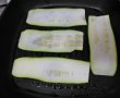 Cei 4 dovlecei ii spalati, ii stergeti cu servetele si le taiati capetele. Ii taiati felii pe lung, cat mai subtiri. Incingeti o tigaie grill, o ungeti cu un strop de ulei si rumeniti feliile de dovlecei pe ambele parti. Le scoateti pe un platou si le lasati sa se raceasca. Dovlecelul mic, spalat, il taiati cubulete.