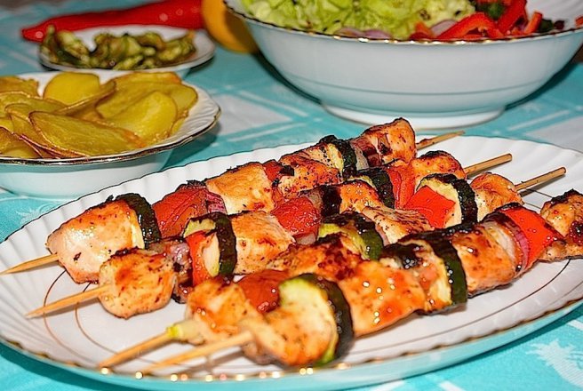 Nu mi-a mai ramas decat sa alternez bucatile de carne si rondelele de legume pe cate o frigaruie, in asa fel incat sa fie frumos colorate. Fara nici o regula. :)