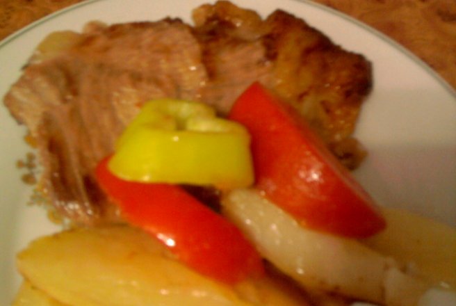 O asezonam cu sare,piper ,oregano si asezam intr-o tava ,asezam cartofii,  turnam uleiul in care am tras carnea si vinul .Condimentam cartofii si bagam tava la cuptor .Dureaza aproximativ 1 ora pana se vor rumeni .