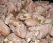 Într-o tavă de copt unsă cu ulei se pune carnea bucăţi într-un singur strat. Se dă la cuptor. După 10 minute se scoate tava şi se întoarce carnea, să se albească pe ambele părţi.