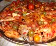Am pus totul intr-o tava si am pus deasupra , uleiul , pasta de gogosari , otetul de fructe si caperele .