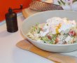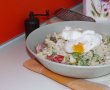 Pentru sos: amestecam toate ingredientele scrise mai sus. Dupa ce pastele au fiert, le strecuram si le amestecam cu sosul facut anterior. Adaugam legumele taiate si le amestecam cu o lingura. Lasam pastele sa se intrepatrunda de arome pana facem ouale. Punem apa la fiert intr-o craticioara inalta. Cand apa ajunge la punctul de fierbere, incepe sa faca mici bule, oprim focul.Cu o lingura de lemn agitam rapid apa din cratita, apoi punem imediat cate un ou intr-un castronel si apoi il rasturnam usor in apa. Lasam 1 minut fara sa amestecam, apoi tot cu lingura agitam usor apa. Lasam in total 3 minute sa stea ouale in apa, apoi le scoatem cu o spumiera.