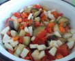Se curăță cartofii, se spală și se taie cubulețe, iar usturoiul se curăță, se spală și se taie mărunt. Se adaugă și acestea în cratiță, odată cu pasta de tomate subțiată cu un pahar de apă. Se condimentează cu sare și piper, după care se dă cratița la cuptor, la foc mediu, pentru 25-30 minute.