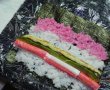 Cum am facut...  Pai, am facut o omleta din doua oua pe care am lasat-o sa se raceasca si am taiat-o mai apoi in fasii de aproximativ un centimetru latime. Am pus la fiert orezul intr-un vas cu apa cu putina sare. Proportia...normala. O cana cu orez la trei cani cu apa. Dovlecelul si unul din  morcovi i-am feliat cu un cutit de curatat legume, la fel ca in cazul terinei. Celalalt morcov, ardeiul, jumatate de castravete si fructul de avocado i-am taiat in felii lungi. Pentru ca este ceva mai tare, bastonasele de morcov le-am oparit in putina apa cu sare. Macroul l-am taiat in lung pe sira spinarii, i-am scos oasele si l-am taiat pe cat posibil in fasii, pe lungime. Mai trebuie sa pregatim si otetul care va da stralucire si gust orezului. Pentru asta am pus la fiert cam o cana de otet cu doua-trei lingurite cu zahar si o lingurita cu sare. Le-am lasat sa dea in clocot, pentru ca sarea si zaharul sa se topeasca bine apoi l-am dat deoparte. Dupa ce orezul s-a fiert si s-a umflat perfect, astfel incat sa devina cleios si sa nu mai contina apa, l-am rasturnat pe un platou mai mare si l-am stropit cu amestecul de otet, turnat in fir subtire, timp in care am amestecat incontinuu cu o spatula, dupa care am lasat orezul sa se raceasca la temperatura camerei. Orezul trebuie sa aiba un gust dulce acrisor, nicidecum sa fie fad si nearomat. De aceea va sfatuiesc ca otetul sa-l faceti dupa gustul dumneavoastra. Nu am trecut la ingrediente, dar pentru ca aveam in casa salata de sfecla rosie, mi-a trecut prin cap, ca o parte din orez, sa-l amestec cu suc de sfecla pentru un plus de culoare. A fost o alegere de moment. Daca stau bine si ma gandesc, as fi putut sa pun cateva bucatele de sfecla si in interiorul rulourilor, dar mi-a fost teama sa nu devina prea colorate... Data viitoare nu o sa-mi mai fie teama si o sa incerc si aceasta varianta! :-)) Cand toate ingredientele au fost pregatite, nu mi-a mai ramas decat sa invelesc o rogojina de bambus cu folie de celofan, (pentru a nu cauta dupa aceea boabe de orez printre betele de bambus...:-)) si sa ma apuc de infasurat... Am luat cate o foaie de nori si am asezat-o la marginea rogojinei, apoi am presat orez peste aproape toata suprafata, lasand un capat liber pentru a se inchide bine ruloul. Am folosit, asa cum o sa vedeti in poze, orez alb pe cea mai mare parte din suprafata, si o portiune mai ingusta cu orez colorat cu suc de sfecla, pentru a rupe monotonia... Pentru a umple rulourile va folositi de imaginatia dumneavoastra si combinati ingredientele pe care le aveti la dispozitie, dupa bunul dumneavoastra plac. De exemplu castravete, macrou, morcov fiert, ardei si hrean sau avocado, surimi, ardei si omleta sau macrou, avocado si ardei sau...orice combinatii va trec prin cap la momentul respectiv! Rulati apoi cu grija foile de alge, avand grija sa tineti presate si ingredientele ruladei, pentru a ramane grupate si a nu se imprastia peste tot. Va sfatuiesc ca, pentru o mai buna intelegere, sa cautati filmulete despre cum se face sushi, pe Youtube. Asa o sa va dati cel mai bine seama despre ce este vorba.