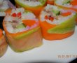 V-am spus mai devreme ca am feliat un dovlecel si un morcov, la fel ca in cazul terinei. Am vazut cu cativa ani in urma, pe net, o fotografie, in care erau niste rulouri sushi portocalii si verzui, fara sa aiba si explicatii atasate. Eu am dedus ca nu pot fi facute decat, in mod sigur din morcovi si, la alegere, din felii de castravete sau dovlecel. Eu am ales dovlecelul. Am oparit feliile de morcovi, cum am mai spus, timp de 20 de secunde iar dovlecelul pentru 12-14 secunde, le-am clatit in apa rece dupa care le-am scurs. Le-am asezat pe rogojina, dupa cum se vede in imagine si apoi am procedat la fel ca si in cazul rulourilor cu foaie de alge. Dupa ce le-am rulat, eu am invelit fiecare rulou in folie de aluminiu si le-am lasat la rece cateva ore, taindu-le inainte de a fi servite. In momentul servirii ar fi foarte bine daca ati avea sos de soia si putin ghimbir murat. Ar da un plus de autencitate, acestor rulouri de inspiratie japoneza, facute mai mult cu ingrediente autohtone...ca doar ce...noi nu putem??? :-)