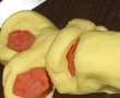 Pe fiecare patratel punem cate o bucata de cabanos, il invelim bine in aluat apoi cu un cutit taiem felii dar nu pana jos, mai lasam putin cat sa se tina in aluat.