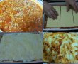 Pentru asamblare: eu am folosit o tavă de ceramică pe care am pus-o în altă tavă mai mare, în caz că lasagna se umflă şi dă peste, dar nu am avut probleme. Astfel, într-o tavă unsă cu puţin ulei se pune un strat subţire de sosalb, apoi 3 foi lasagna una lângă alta (eu am pus 3 foi pentru că atât mi-au încăput, însă ţineţi cont de dimensiunea tăvii dvs), sosalb, sos Bolognese, apoi iar foi lasagna, sosalb, sos Bolognese, iar la final foi lasagna, sos alb, caşcaval ras.