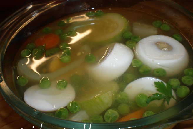 -intr-un vas termorezistent am asezat mazarea fiarta si bine scursa (pastrati supa de mazare pentru aspic), rondelele de morcovi, dovleceii bine scursi de apa. Daca legumele nu sunt bine scurse de apa, riscati sa nu sa se intareasca bine aspicul.