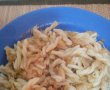 In alta oala se pune apa la fiert pentru paste care se fierb 5 minute, apoi se stinge focul si se mai lasa 2-3 minute sa se umfle. Se strecoara si se spala. Se amesteca cu varza calita.