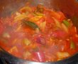 Amestecam bine cu o paleta, punem si sucul de rosii, apoi pasta de tomate, boiaua dulce, foaia de dafin, apa si lasam pentru 20 de minute la foc foarte mic sa se intrepatrunda gusturile. Potrivim de sare si piper, sa ne placa.