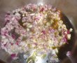 Intre timp taiem ceapa si usturoiul( cei 3 catei ramasi) marunt. Intr-o cratita mare, punem doua linguri de ulei de masline, doua linguri de apa si adaugam ceapa si usturoiul dupa ce le-am frecat cu putina sare.