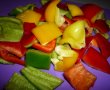 Punem in tava de copt o foaie pergament si pe ea se aseaza ardeii, ceapa pe margine si 3 catei de usturoi. Stropim cu 3 linguri de ulei de masline, (eu am o sticluta cu atomizor). Am copt ardeii, ceapa si usturoiul pentru 30 de minute la 200 de grade. Ceapa si usturoiul, coapte si adaugate apoi in mancare vor oferi acesteia un gust deosebit.