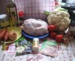 Peste rosii montam bucatile de carne semi fierte, apoi conopida oparita si morcovii peste.