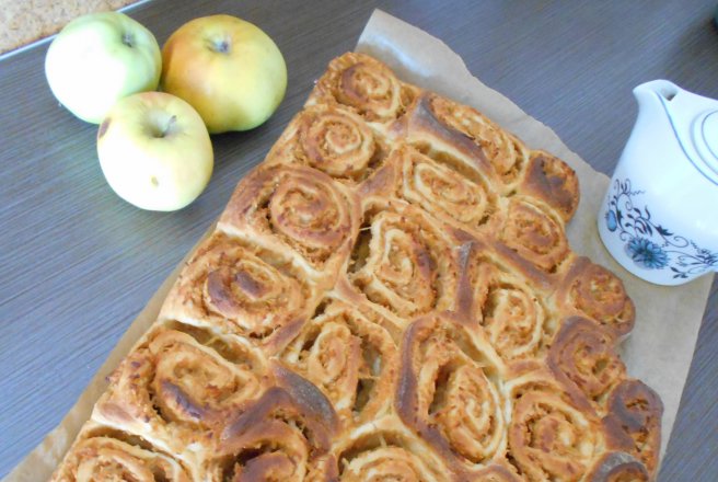 Aluatul dospit il punem pe masa de lucru infainata si il impartim in doua partie egale. Intindem prima jumate, punem pe ea jumate din cantitatea de mere calite si intindem merele pe toata suprafata aluatului. Rulam pana obtinem un sul.