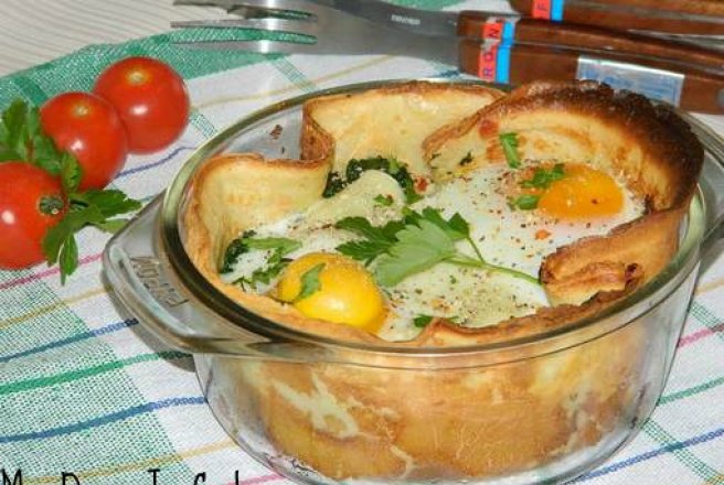 Ungem o forma de yena sau termorezistenta cu unt. Pe fundul formei punem o clatita . Taiem ardeiul cubulete,usturoiul feliute,ceapa julien,le calim intr-o lingura de ulei sau putin unt Peste clatita,punem un strat cu piept de pui taiat cubulete sau fasii,peste cateva masline. Spanacul il calim si pe el in putin unt,dupa care il intindem peste masline. Peste spanac punem o felie de cas sau branza si spargem doua oua. Presaram putina sare,piper si boia si dam forma la cuptor pana este facut oul. Decoram cu patrunjel verde si servim. Pofta Buna !