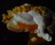 Se pun apa si otetul la fiert. Se prajeste painea. Se da focul mic, se sparge oul si se lasa sa cada usor in apa. Se lasa sa se lege putin albusul si se poate da focul mai tare. Cind e fiert asa cum doriti, cu galbenusul moale sau tare, il scoateti usor cu o spumiera si il asezati delicat pe felia de paine. Adaugati smantana, porumbul, carnaciorul, sarea si piperul.