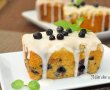 Tava se pune în cuptorul încălzit la 190 grade C unde se lasă aproximativ 25 minute. Faceţi proba cu scobitoarea. Calde încă, mini checurile se scot din tavă. Glazura preparată conform indicaţiilor de pe pachet se toarnă, apoi se întinde peste fiecare bucată de mini chec rece. Se ornează cu boabe de afine şi frunze de mentă.