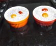 se imparte compozitia in forme mici unse cu unt,deasupra se pun cate 2rosii cherry si se lasa la cuptor pana se rumenesc deasupra,aproximativ 20min apoi se servesc direct din forme.