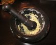 Usturoiul se curata, se pune in mojar, se presara sare si se marunteste. Se adauga uleiul si vinul, se amesteca pana se omogenizeaza, iar la final se adauga iaurtul. Se amesteca usor si se mai pune putina sae daca e nevoie.