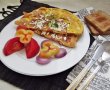 Se inclina tigaia intr-o parte si in alta pentru a se intinde compozitia uniform, iar cand omleta este rumenita pe dedesupt, se intoarce cu o spatula si pe partea cealalta.
