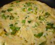 Adaugam ouale batute iar cand incep sa se inchege adaugam ceapa verde si cascavalul. Lasam pe foc pana incepe sa se topeasca cascavalul.